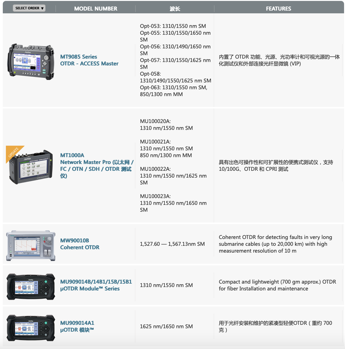 安立公司全面的OTDR系列通過(guò)獨(dú)特的手持式,臺(tái)式和OEM模塊解決方案確保光纖電纜的快速和高度精確的測(cè)量。光纖測(cè)試專家包括用于測(cè)試海底電纜的獨(dú)特的相...