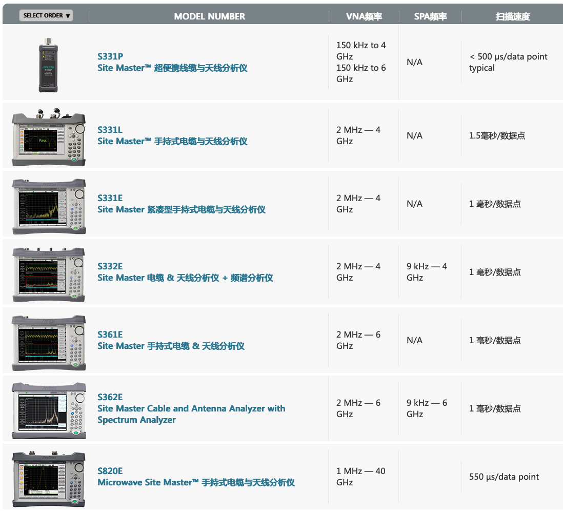 安立公司的SiteMaster系列天饋線測(cè)試解決方案為用戶提供多種選擇:速率涵蓋RF及微波:1.6G、6G、10.5G、20G。